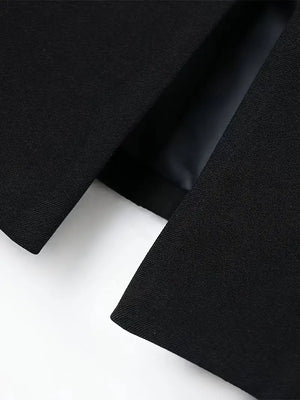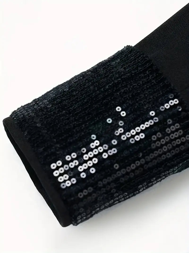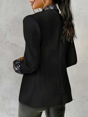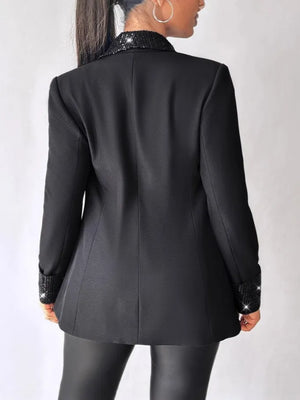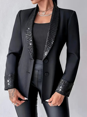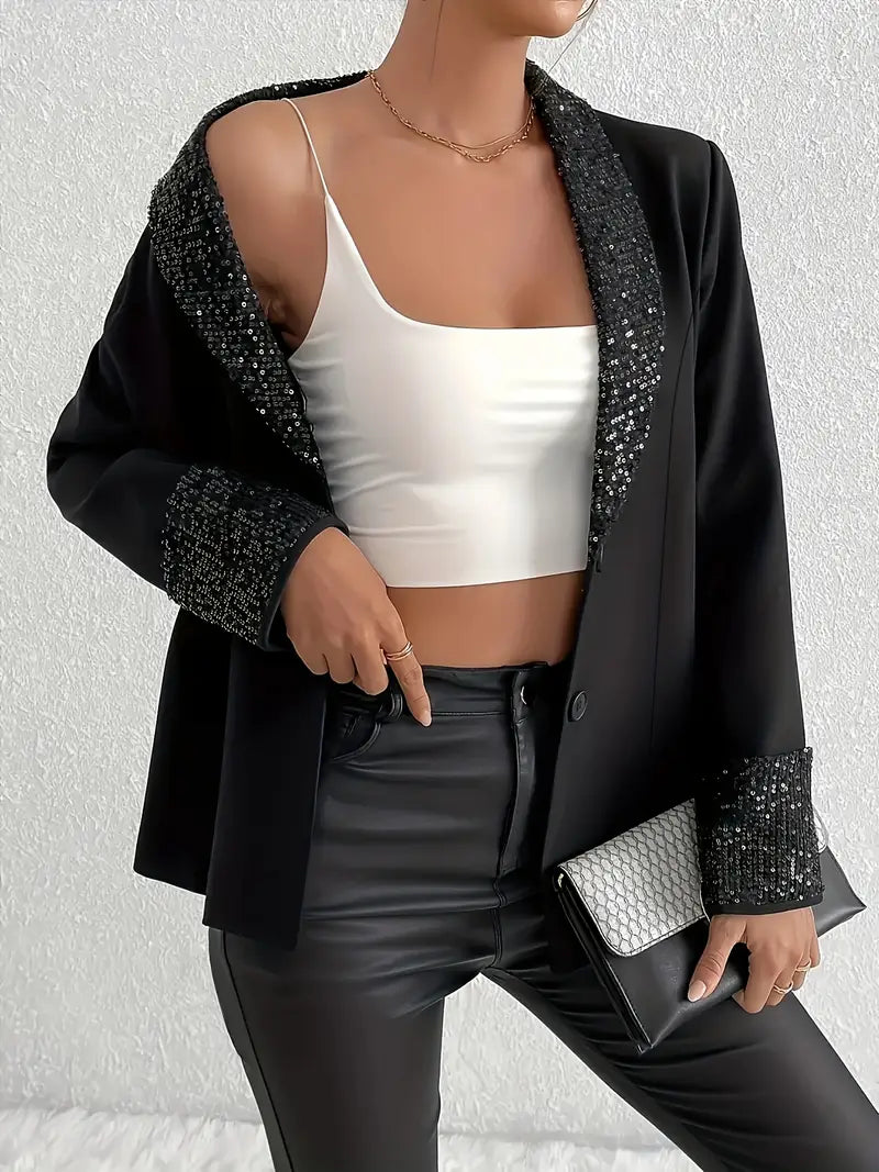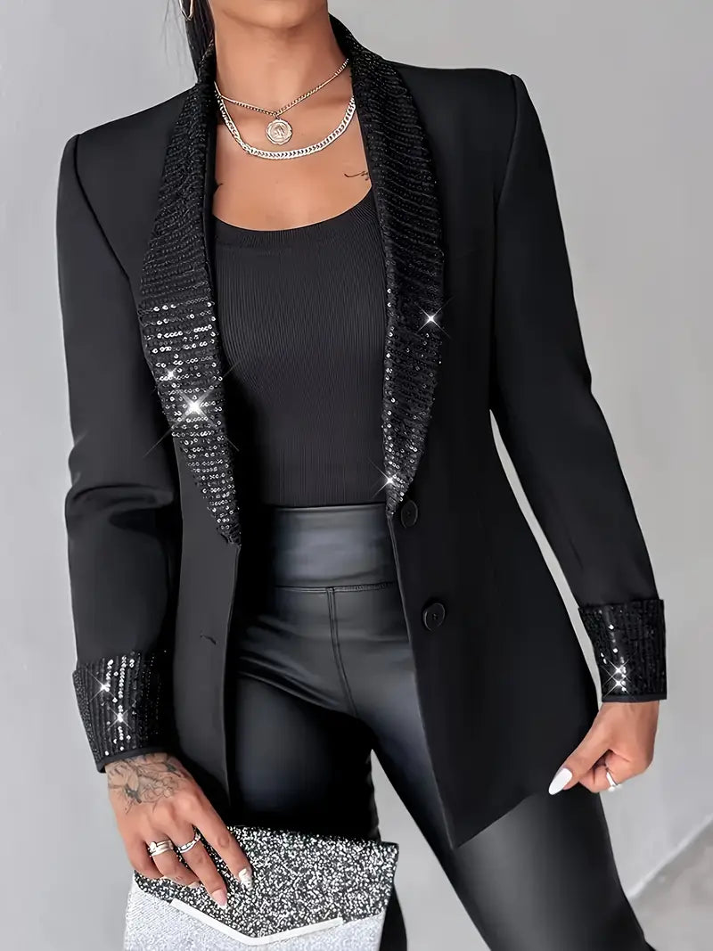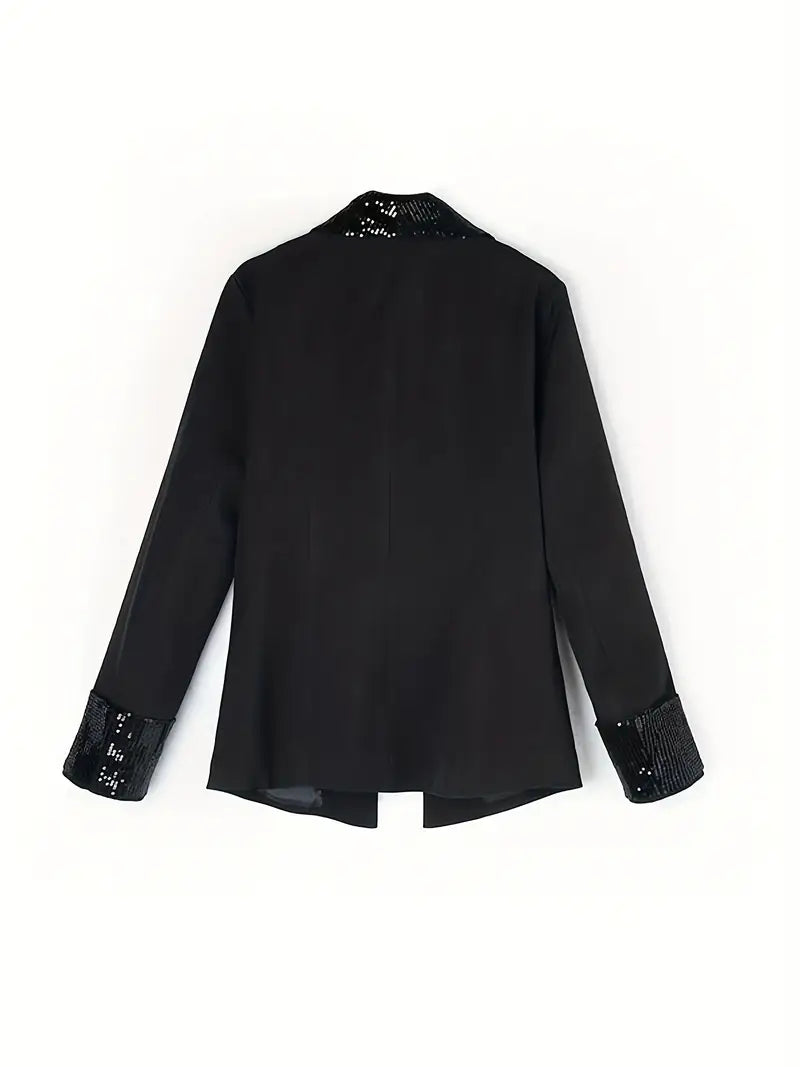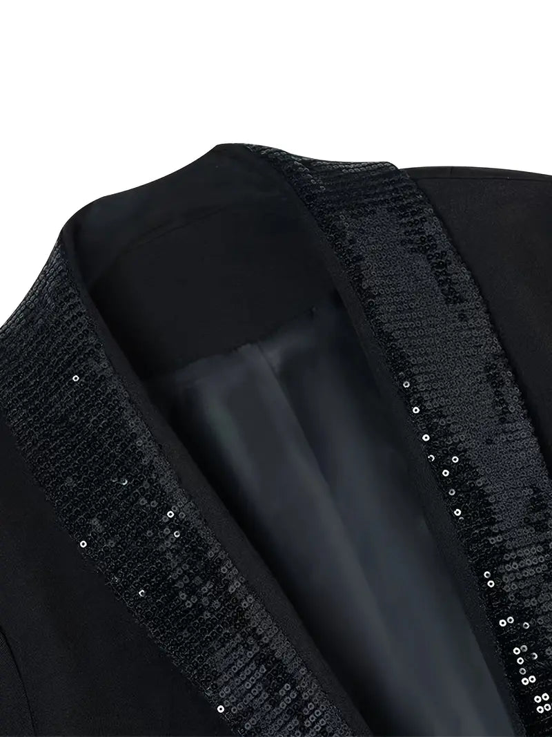 Blazer noir pour femme avec revers et poignets à paillettes, coupe ajustée et col châle élégant. Veste de soirée idéale pour fêtes, événements et looks de nuit chic