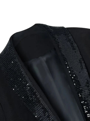 Blazer noir pour femme à paillettes, veste de soirée élégante col châle, revers et poignets brillants, blazer slim fit manches longues pour fêtes, bureau et événements.