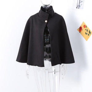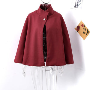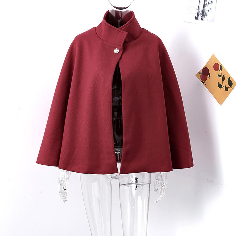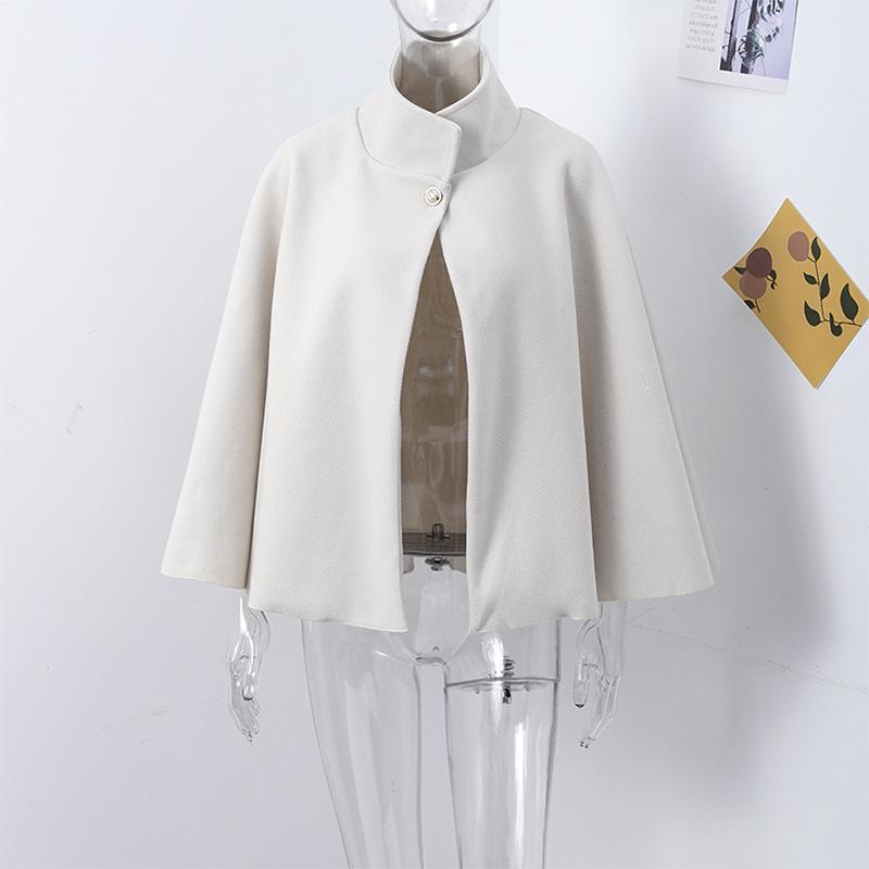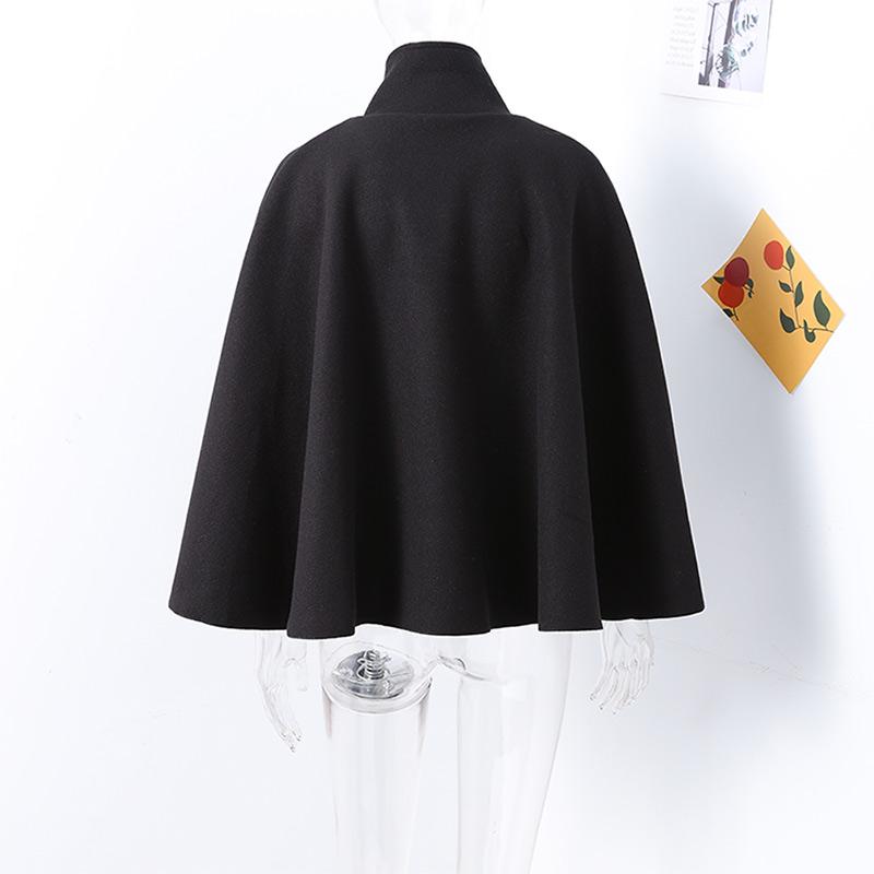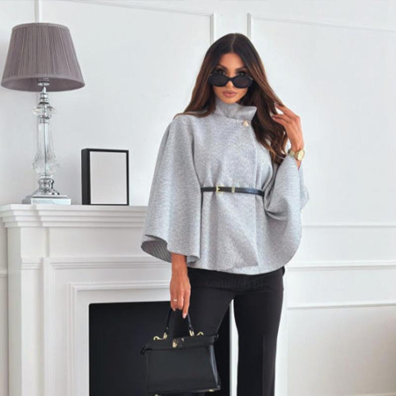 Cette cape poncho souligne une allure très structurée : col montant fermé par un bouton doré, base évasée et manches chauve-souris fluides. La ceinture fine souligne la taille et dessine une silhouette féminine sans serrer. Le tissu moyen-épais, aspect laine, tombe parfaitement et garde une belle tenue tout au long de la journée.