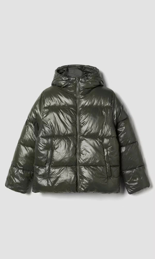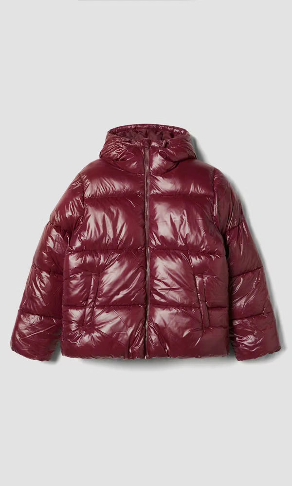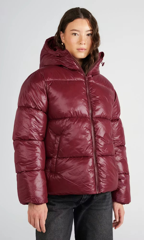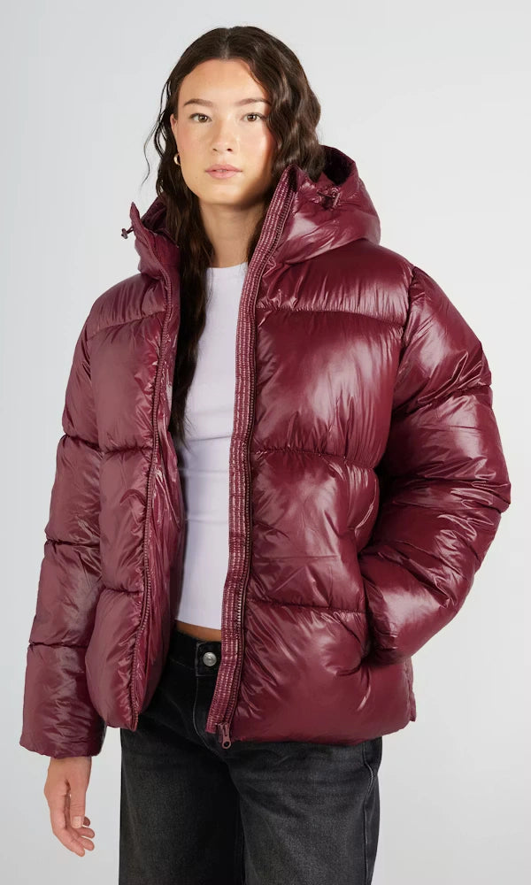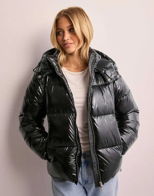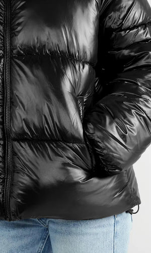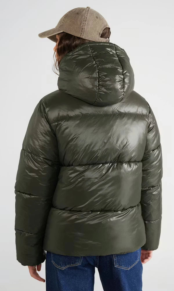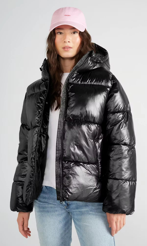 Doudoune matelassée en tissu brillant déperlant, coupe courte et droite qui garde la chaleur tout en restant légère. Fermeture zippée devant, poches latérales pratiques et capuche enveloppante pour affronter le froid urbain avec confort.