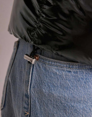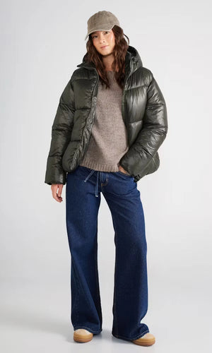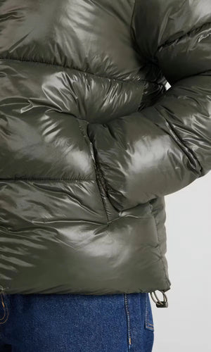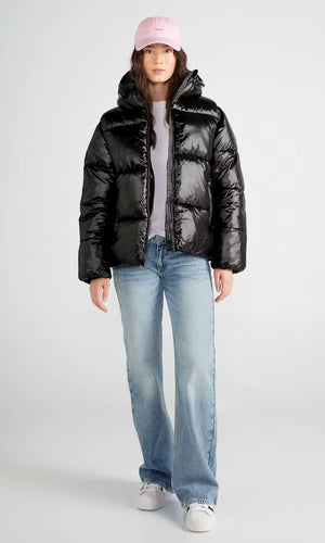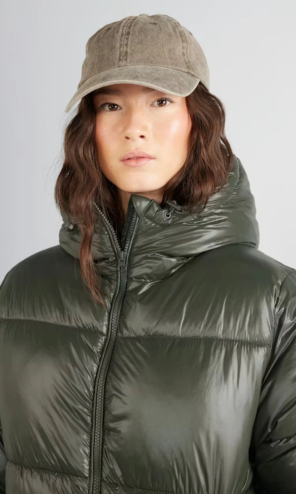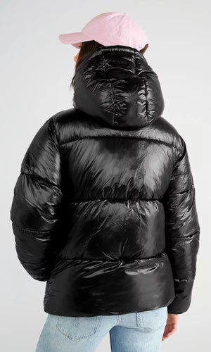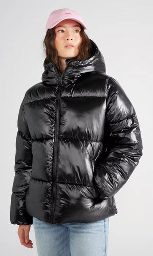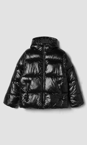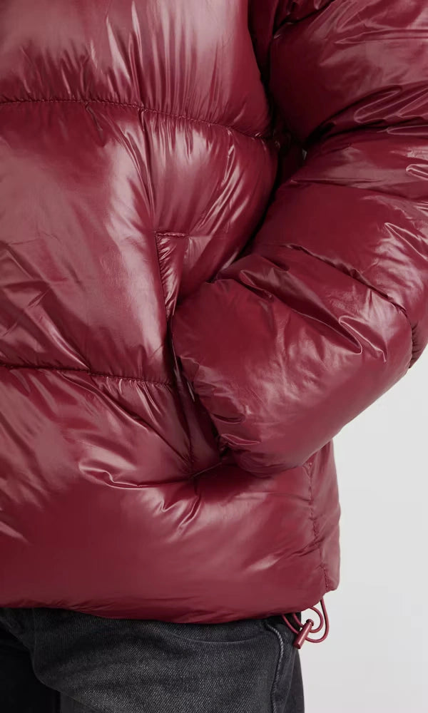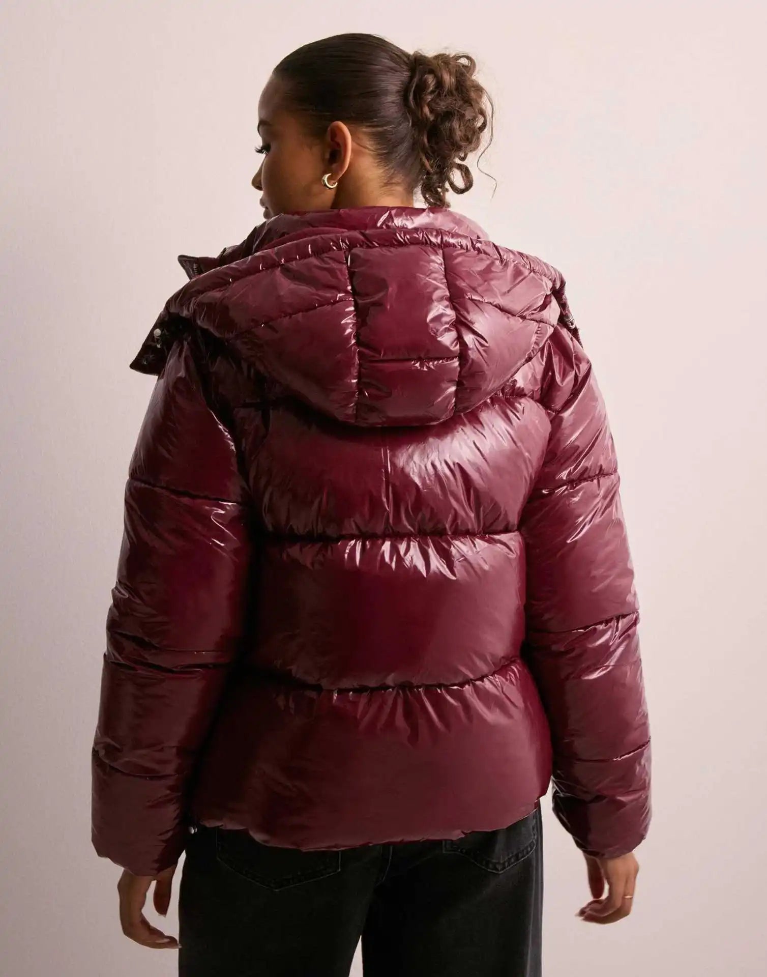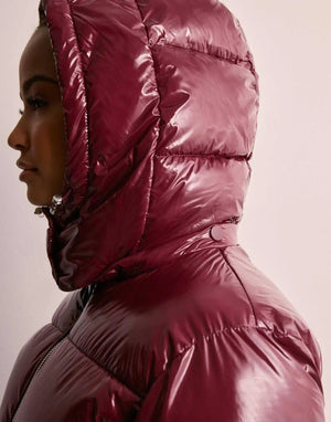Doudoune matelassée en tissu brillant déperlant, coupe courte et droite qui garde la chaleur tout en restant légère. Fermeture zippée devant, poches latérales pratiques et capuche enveloppante pour affronter le froid urbain avec confort.
