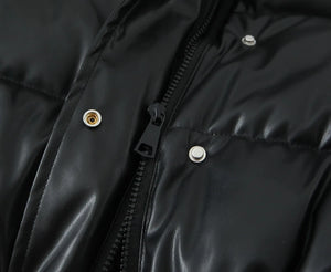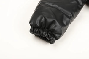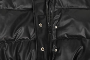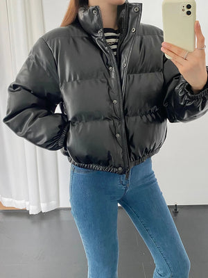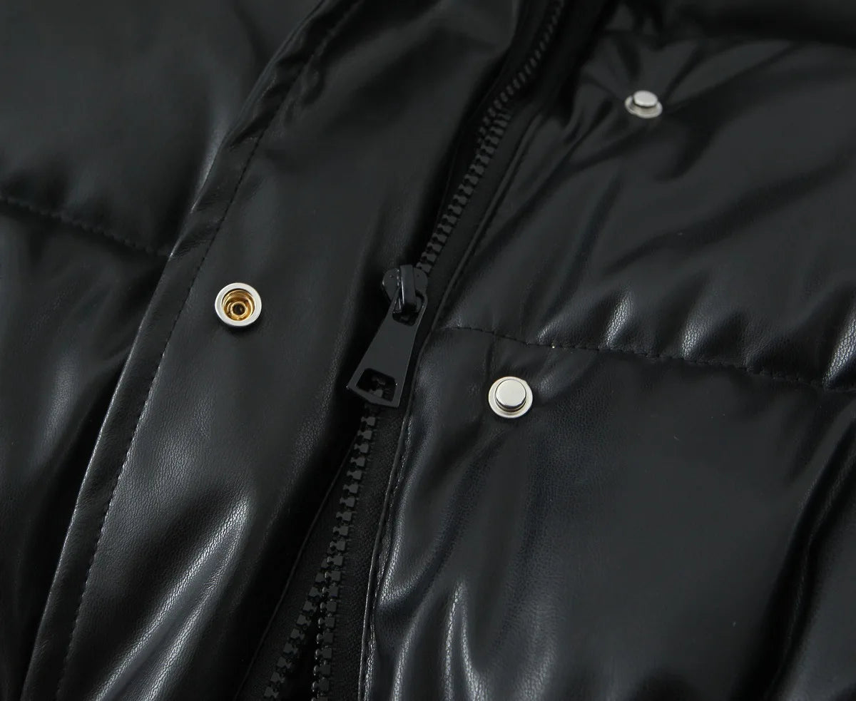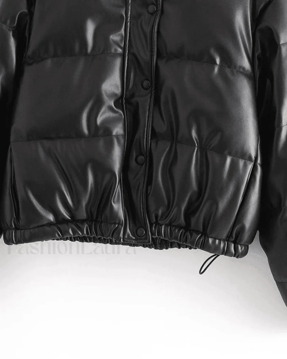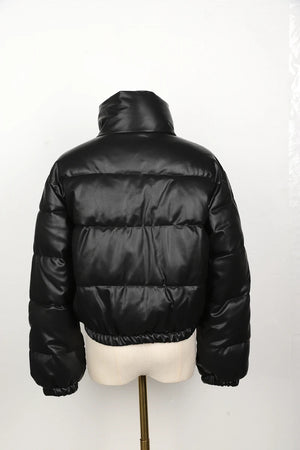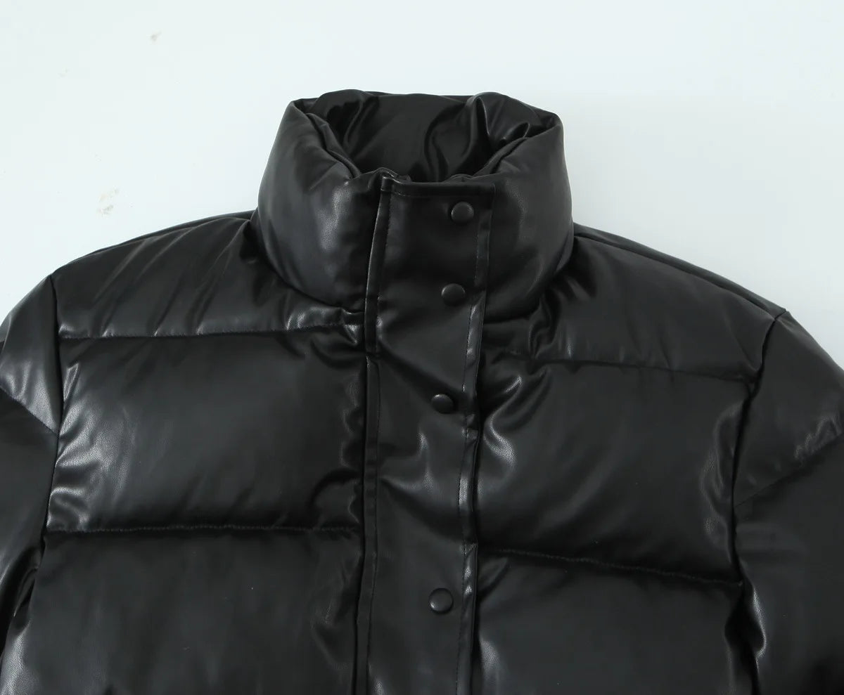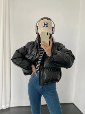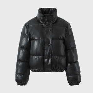 Doudoune courte femme en simili cuir, coupe moderne et matelassée, chaude et légère. Col montant, finition élégante, idéale avec jeans ou robes pour l’hiver.
