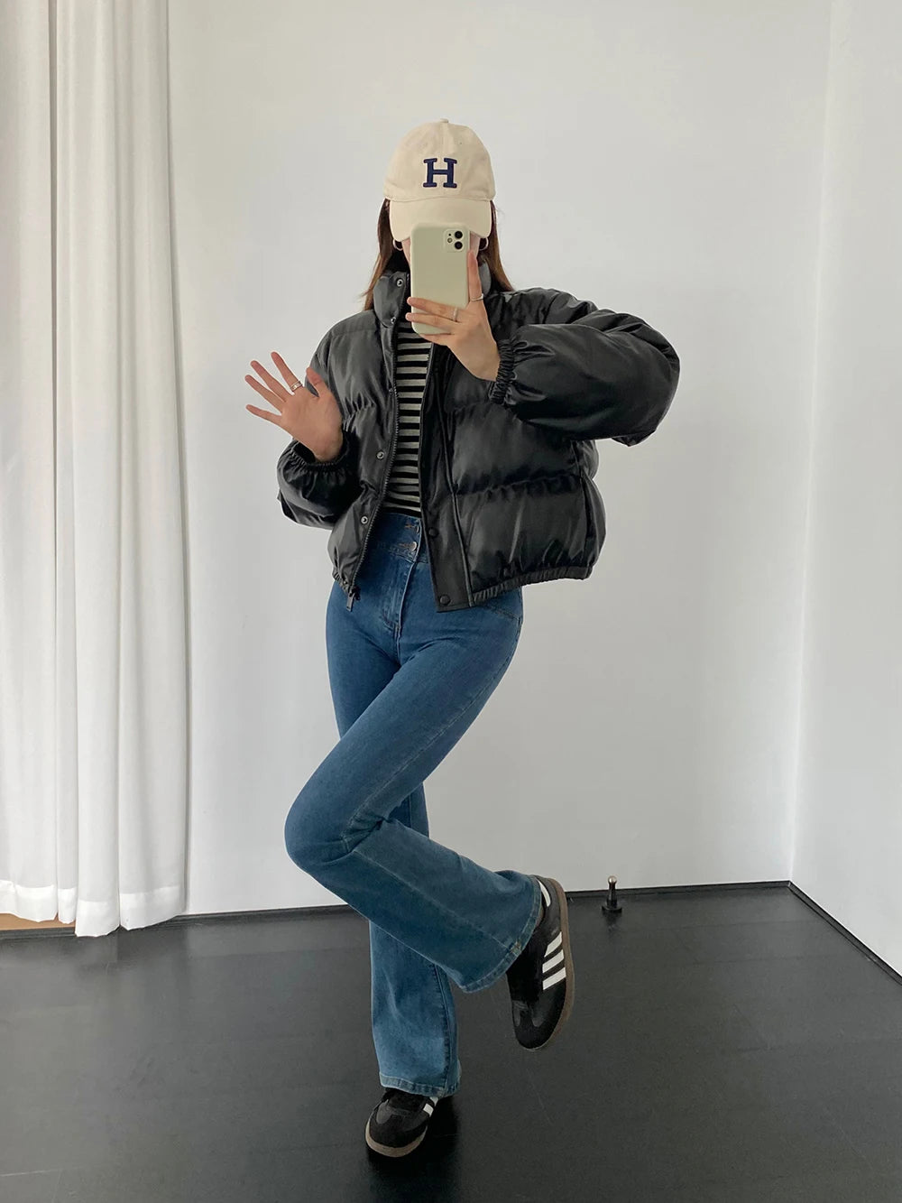 Une doudoune courte, chaude et ultra-stylée. Cette veste matelassée en simili-cuir lisse (sans matière animale) réchauffe tout en dessinant une silhouette moderne, au-dessus des hanches. Son col montant et sa coupe légèrement bouffante signent un look city chic, parfait avec un jean taille haute ou un pantalon noir ajusté.