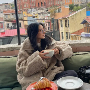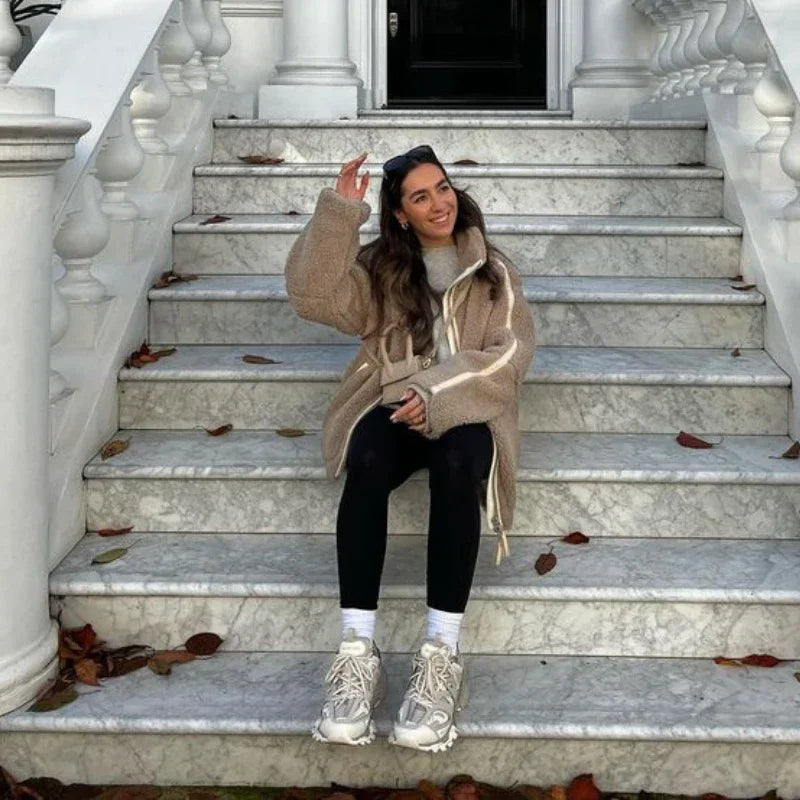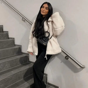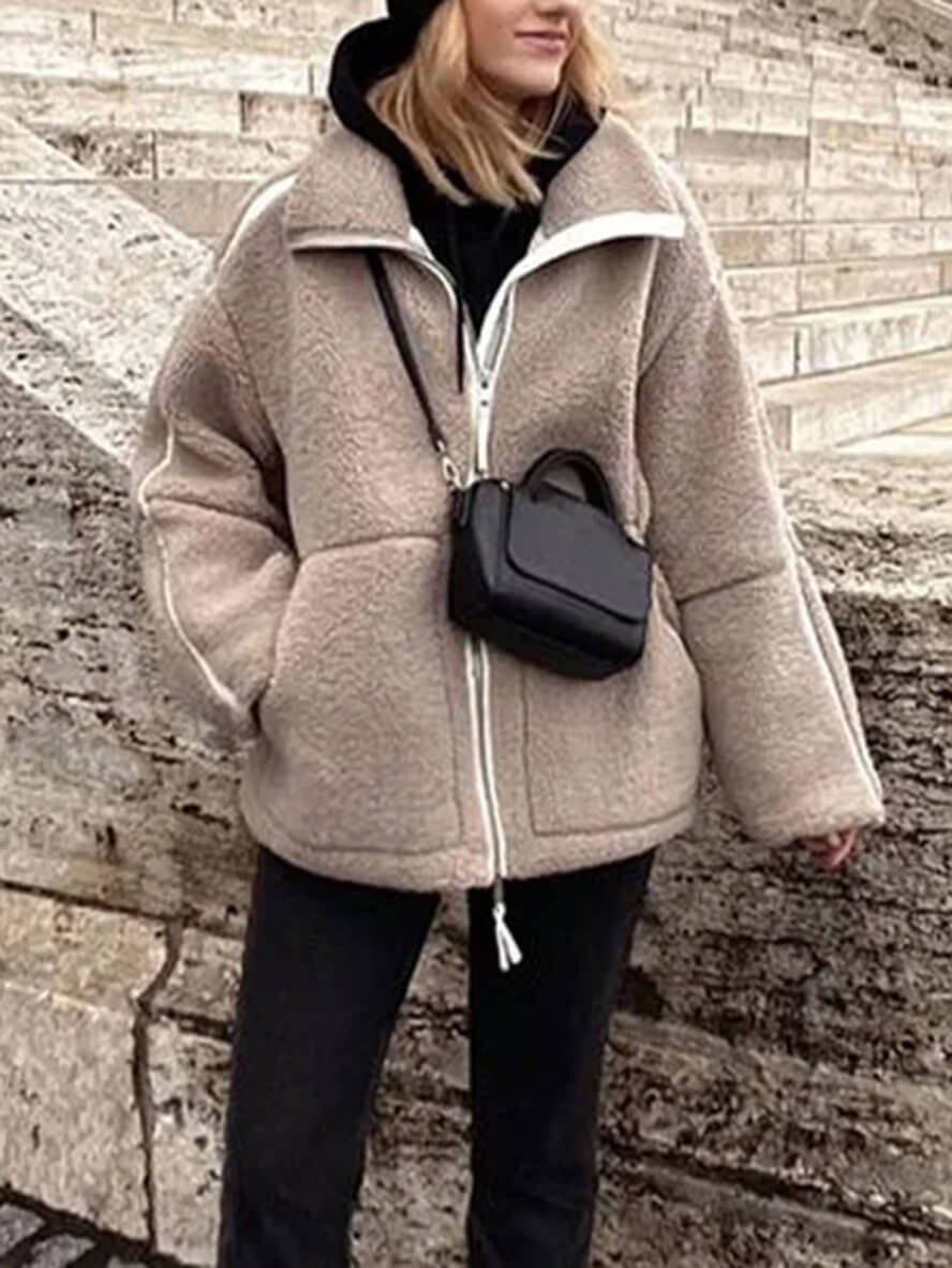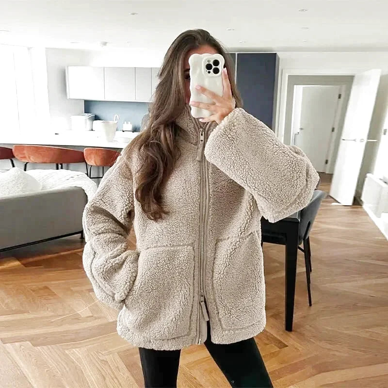 Veste teddy oversize ultra douce à col montant, zip intégral et grandes poches plaquées. Parfaite pour les journées froides, du trajet boulot aux soirées cosy.