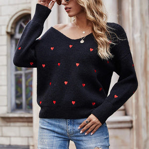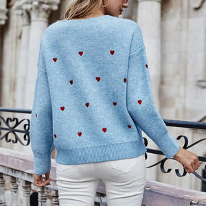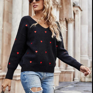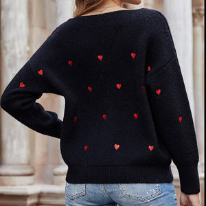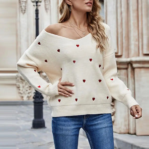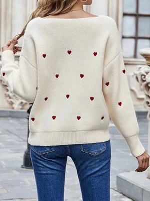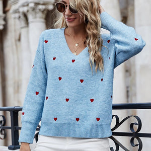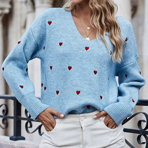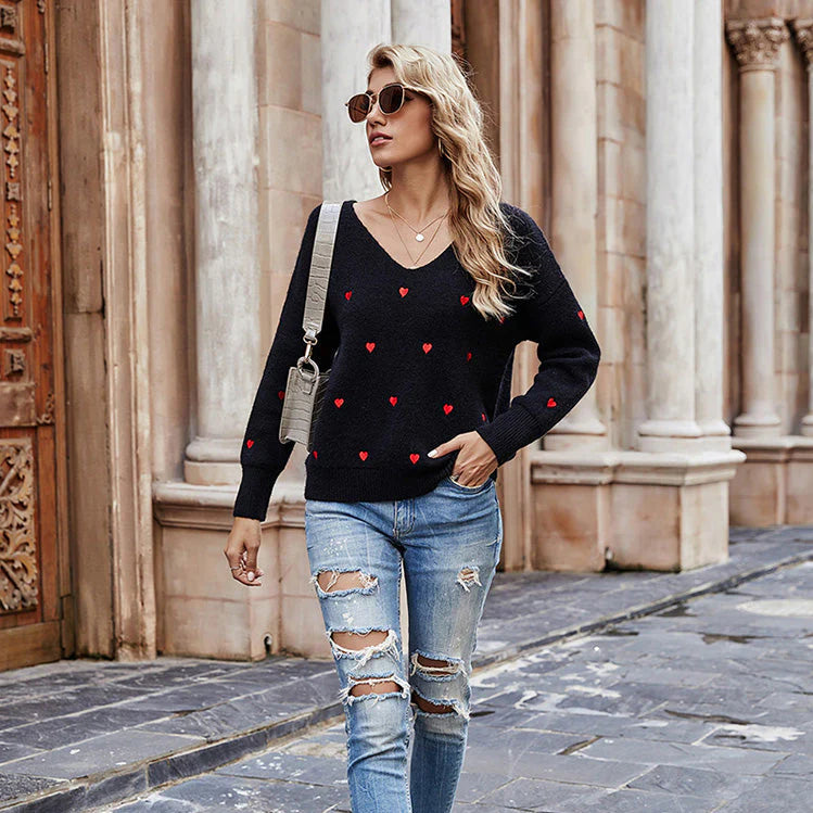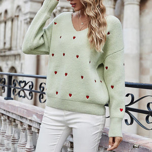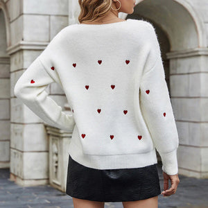 Pull doux à motif cœur brodé en maille acrylique et nylon – coupe ample, col en V et manches longues pour un style romantique et urbain.