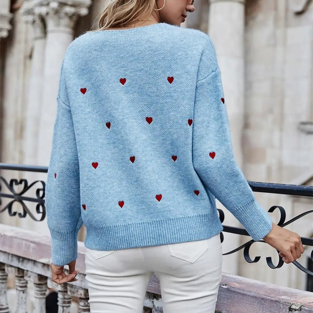 Pull doux à motif cœur brodé – maille chaude en acrylique et nylon, col en V, coupe ample, manches longues, style romantique et urbain