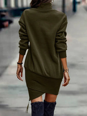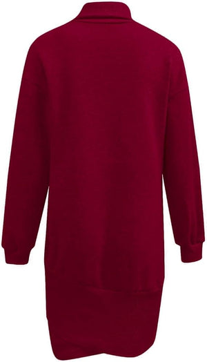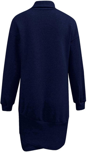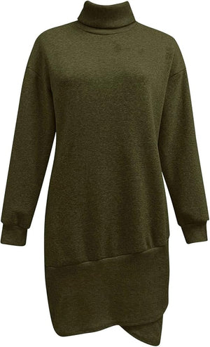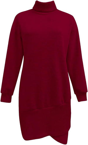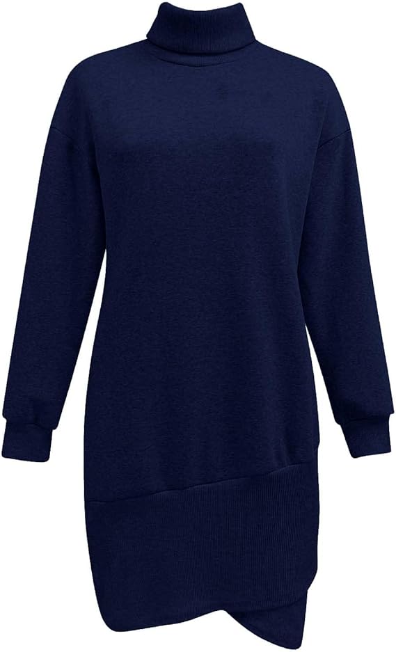 Robe pull femme à col roulé et ourlet asymétrique, matière sweat chaude et extensible. Parfaite en automne-hiver avec bottes ou baskets pour un look casual chic.