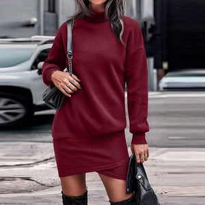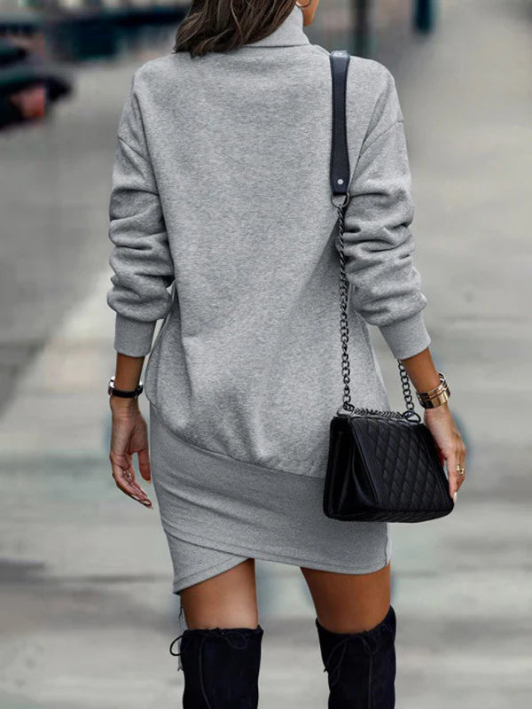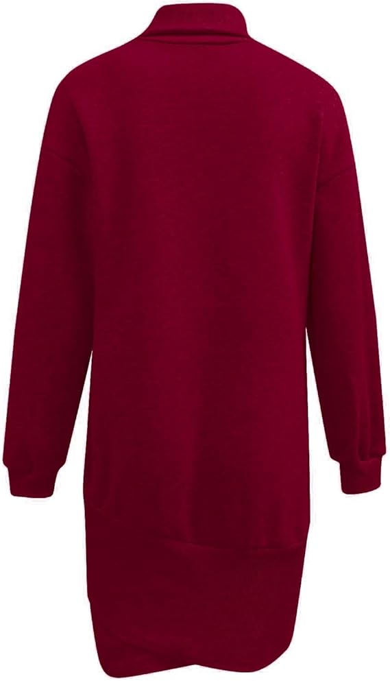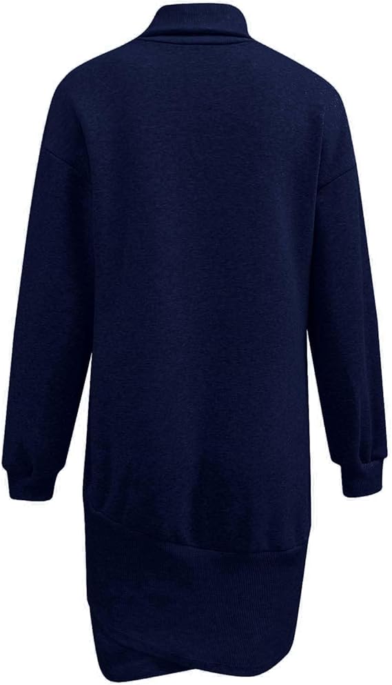 Robe pull femme à col roulé, manches longues et ourlet asymétrique croisé. Matière sweat douce en mélange coton/polyester avec une touche d’élasthanne pour l’élasticité. Longueur mini/au-dessus du genou, coupe légèrement ample en haut et plus près du corps sur le bas pour une silhouette féminine. Disponible en plusieurs couleurs unies : gris clair, noir, bordeaux, vert armée, bleu nuit.