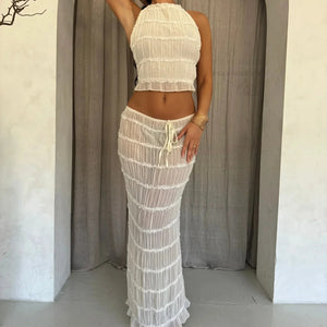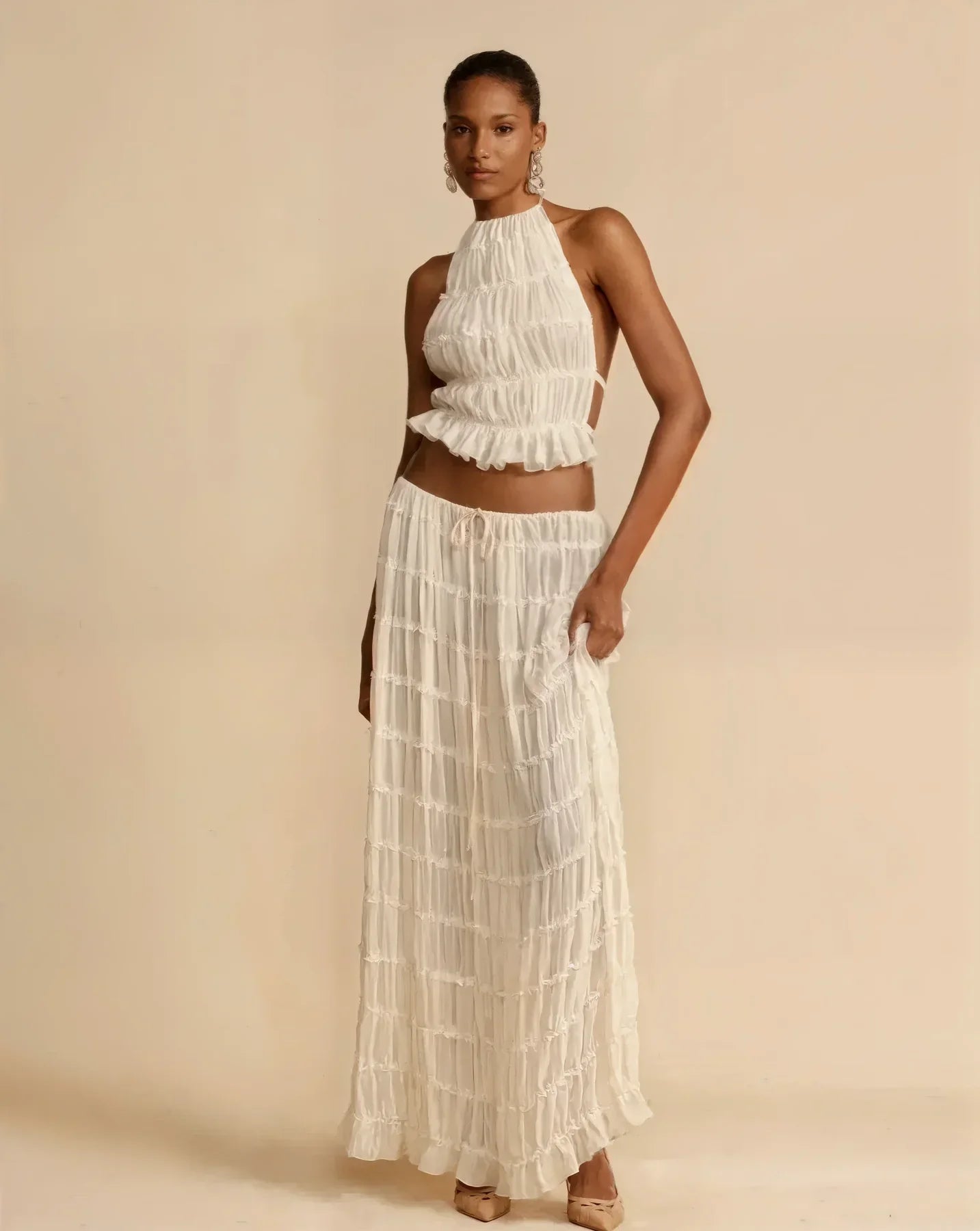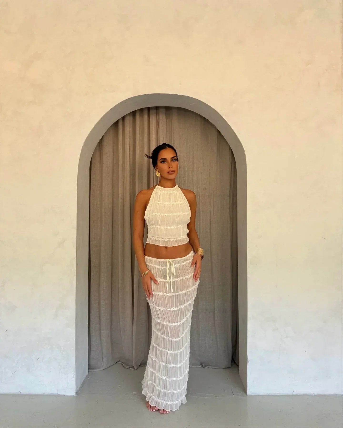 L'Ensemble Alessia présente un top court à bretelles halter froncé et une jupe transparente, longue jusqu'au sol, avec une texture subtile en vagues. Conçu pour les clubs de plage, les soirées estivales et les entrées inoubliables. À porter avec des talons neutres et des accents dorés pour un effet maximal.