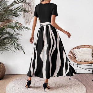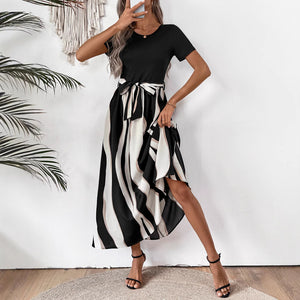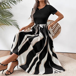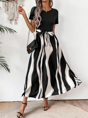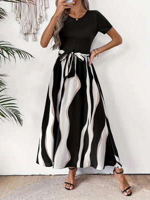 Robe midi femme rayée noir et blanc à taille ceinturée, col rond, manches courtes, coupe fluide et élégante, idéale bureau, sorties et occasions semi-formelles