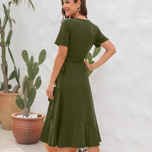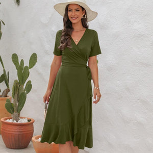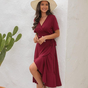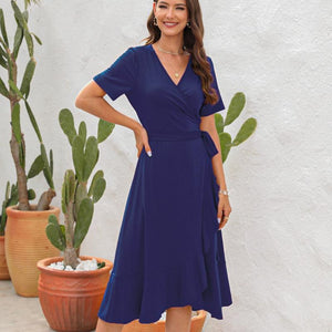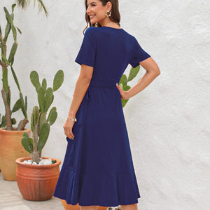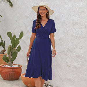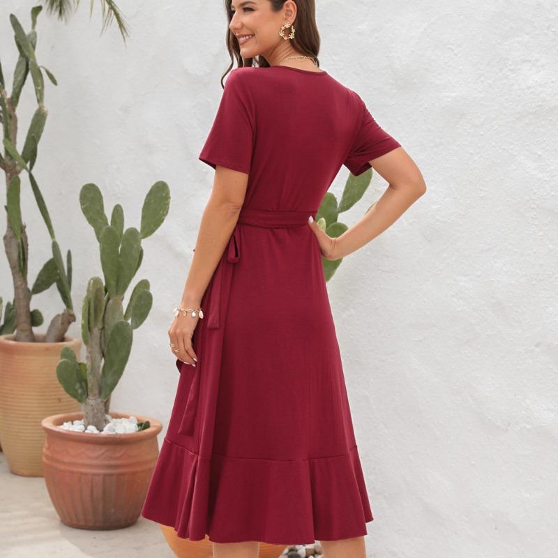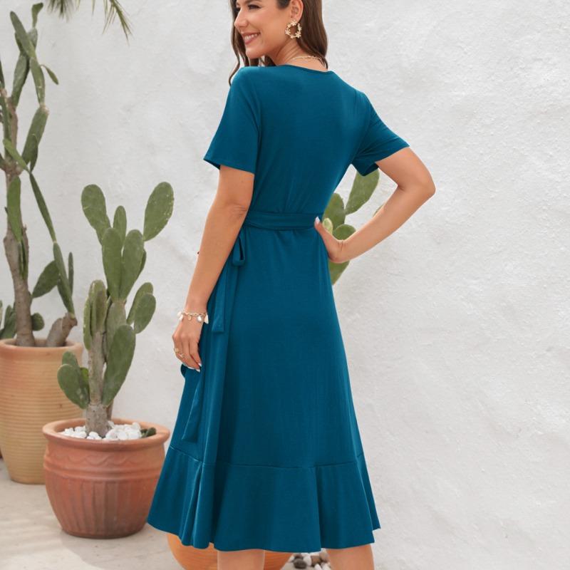Robe longue femme col V profond, découpes latérales et laçage dos, manches courtes volantées, chiffon léger doublé partiel, été et vacances