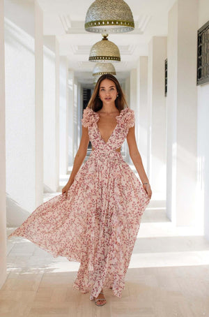 Cette robe longue en chiffon affiche un col V profond souligné par une boucle centrale recouverte et des découpes latérales positionnées au niveau le plus fin de la taille pour affiner la silhouette. Les manches à volants superposés apportent du volume maîtrisé tandis que la jupe fluide tombe jusqu’au sol pour un mouvement aérien.