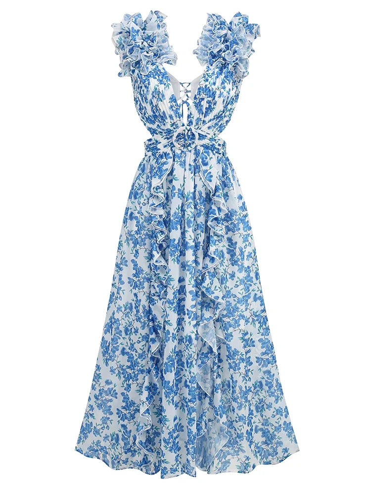 Robe longue femme col V profond avec découpes latérales, manches à volants, dos laçage et boucle centrale — chiffon léger doublé partiel, coupe fluide été/plage