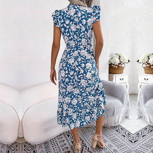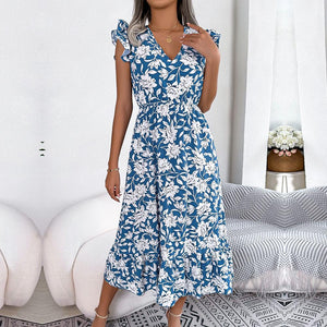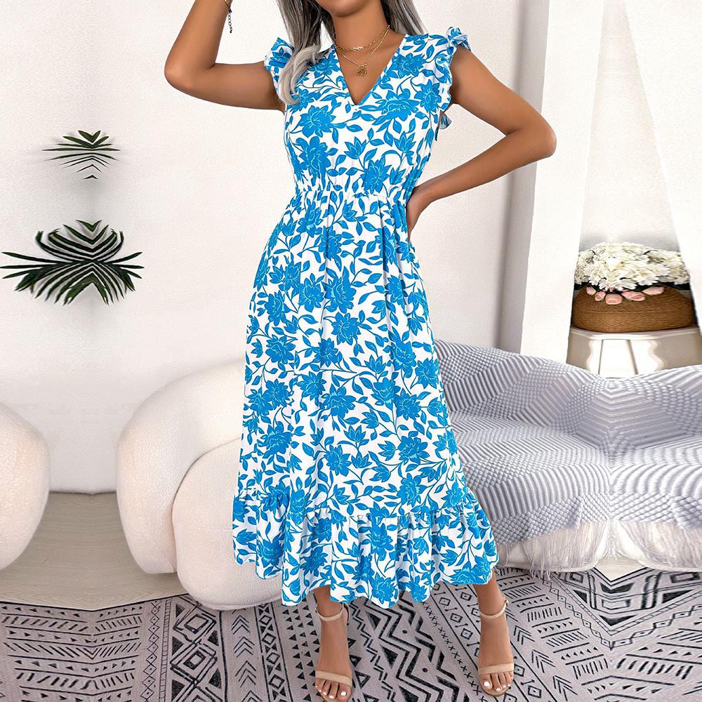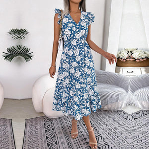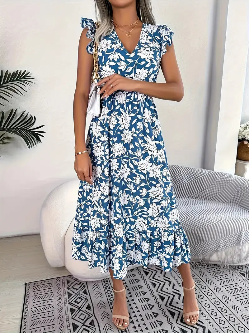 Robe mi‑longue col V imprimé floral — manches volantées sans manches apparentes, taille cintrée élastique, coupe fluide mi‑mollet, fente discrète, polyester léger pour printemps‑été