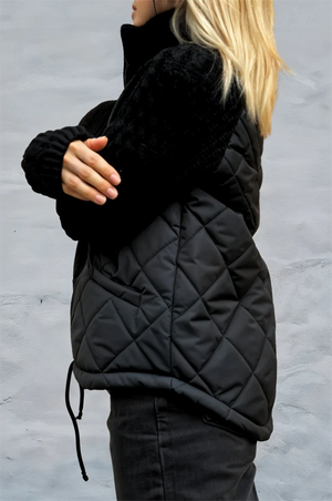 Cette veste matelassée à col montant combine le confort d’un pull en maille torsadée et la chaleur d’une doudoune légère. Le corps matelassé protège du froid et du vent tandis que les manches tricotées offrent une grande liberté de mouvement et une douceur agréable au quotidien. La coupe mi-longue arrive sous les hanches pour bien couvrir le dos et la taille.