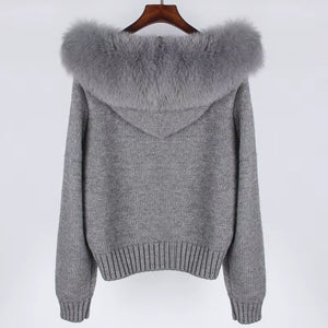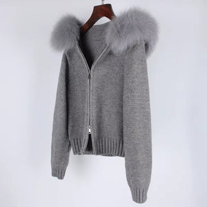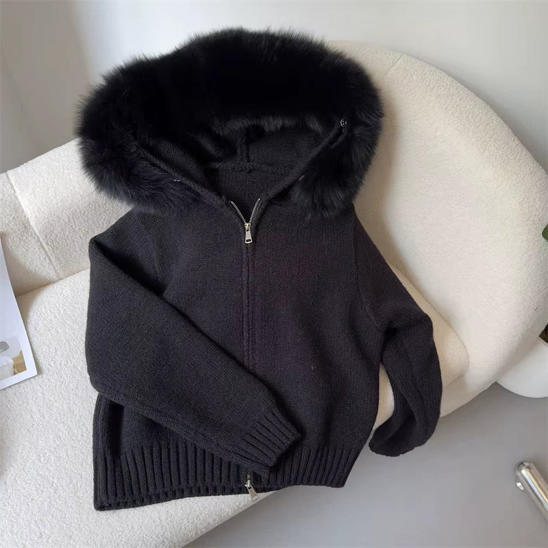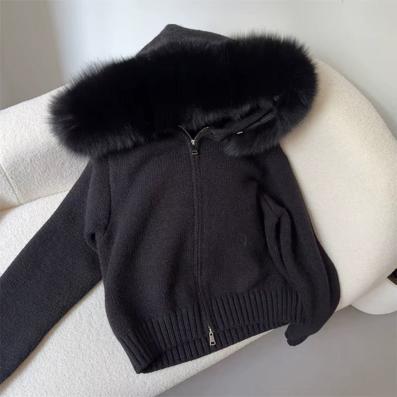 Veste tricotée zippée à capuche pour femme, manteau court chaud avec bord en fausse fourrure effet renard, cardigan hiver maille épaisse manches longues.