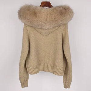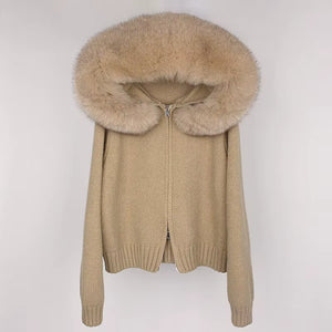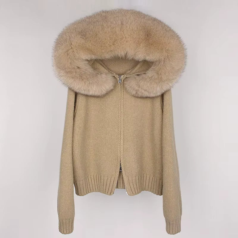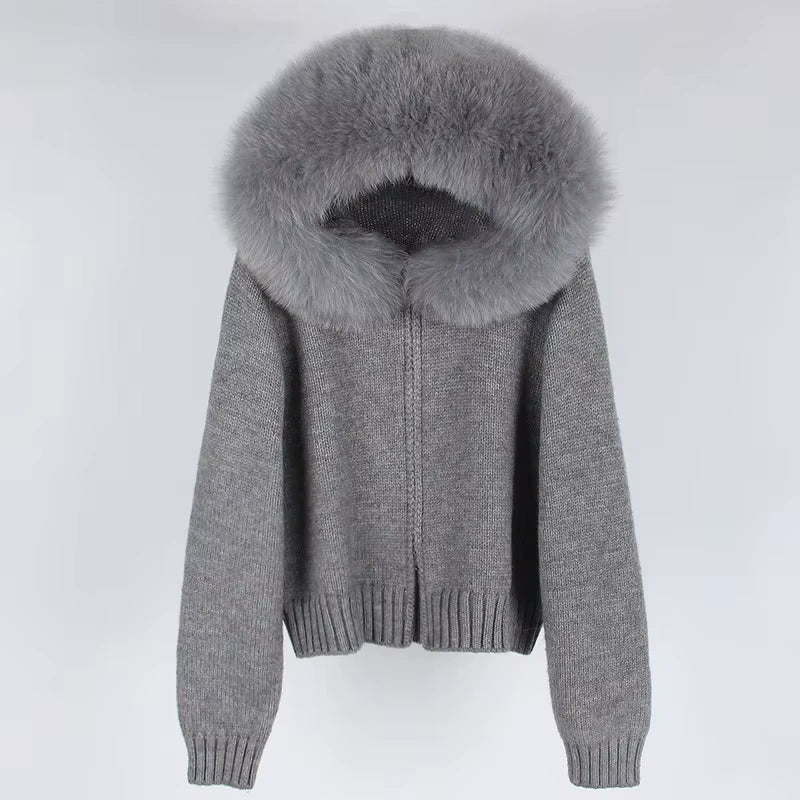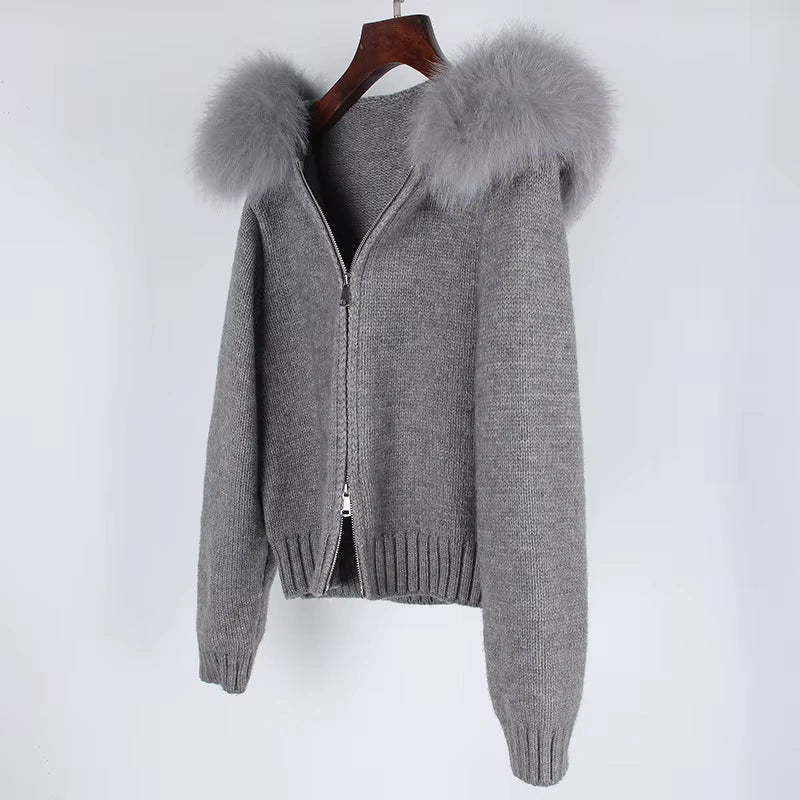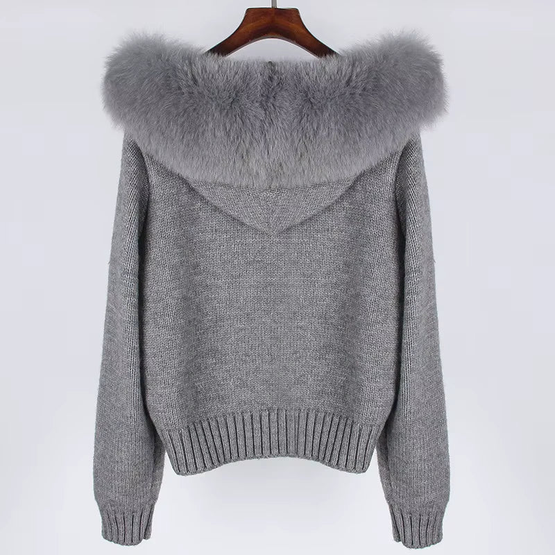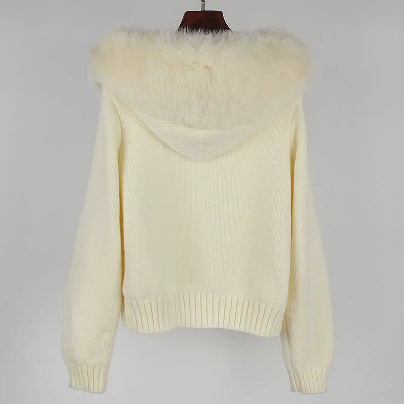 Veste tricotée zippée à capuche pour femme en maille épaisse, conçue pour apporter chaleur et confort en hiver. La capuche est bordée de fausse fourrure effet renard, douce et volumineuse, qui protège du froid et encadre le visage. Coupe courte et droite, facile à porter au quotidien sur un pull fin, un t-shirt ou une robe.